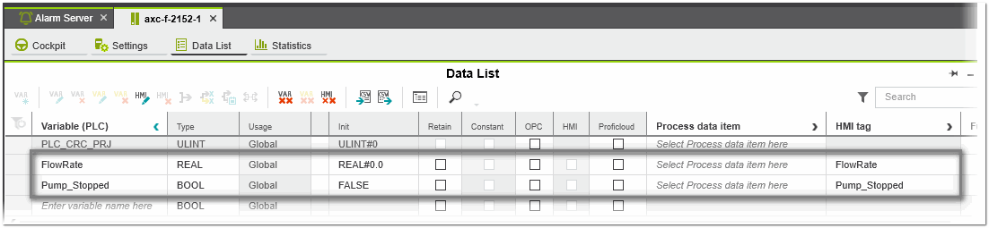 Suppress Condition Variable Name Arp.Plc.Eclr/Pump_Stopped The alarm is suppressed (not shown to the operator), if the boolean variable 'Pump_Stopped' (pump is off) has the value true. Enabled Activated The evaluation of the alarm will be processed. - Assign a program instance of type 'AlarmProgram' to a task in the 'Tasks and Events' editor.(A program instance of type 'AlarmProgram' (available by default) must be assigned to a task to create a valid alarm configuration.)