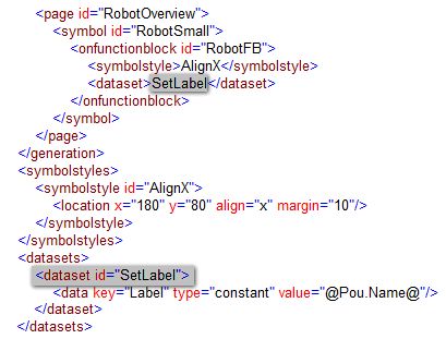 In the example, the dataset definition 'SetLabel' with the values of the <data> child element is applied to the 'RobotSmall' symbol instances on the 'RobotOverview' page.