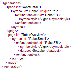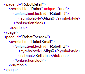 In the example, the 'Robot' symbol instance is created once (unique="true") on the 'RobotDetail' page, even if the triggering FB instance 'RobotFB' (defined by the child element <onfunctionblock>) exists twice in the project. The 'RobotSmall' symbol instance is created twice (unique attribute not used) on the 'RobotOverview' page.