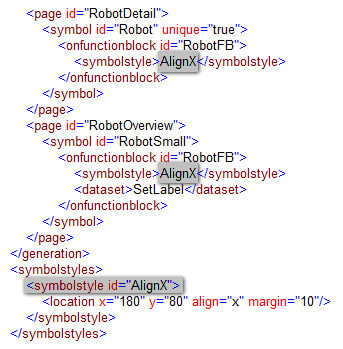 In the example, the symbol style definition 'AlignX' is referenced in the <symbolstyle> elements of the 'Robot' and 'RobotSmall' symbol instance. This means, the values of the <location> child element are applied to the 'Robot' symbol instance on the 'RobotDetail' page and both 'RobotSmall' symbol instances on the 'RobotOverview' page.