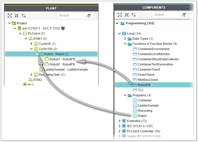 The function block 'RobotFB' is instantiated two times in the program POU 'Robot'. The program POU 'Robot' is assigned to the task 'Cyclic 100'.