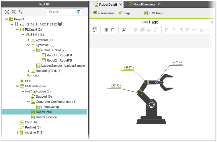 HMI page 'RobotDetail' with an instance of the 'Robot' symbol