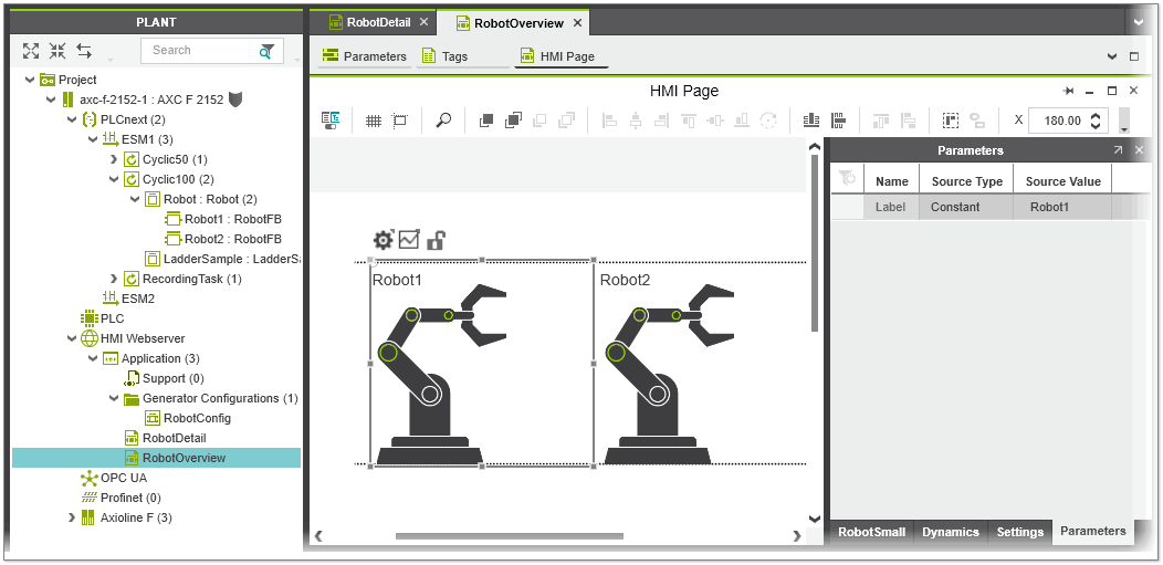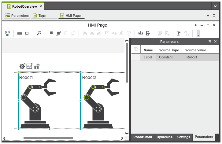 HMI page 'RobotOverview' with two instances of the 'RobotSmall' symbol and configured symbol parameter