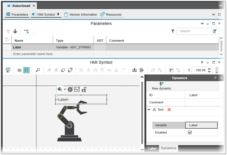 User-defined HMI symbol 'RobotSmall' with symbol parameter 'Label' and 'Text' dynamic