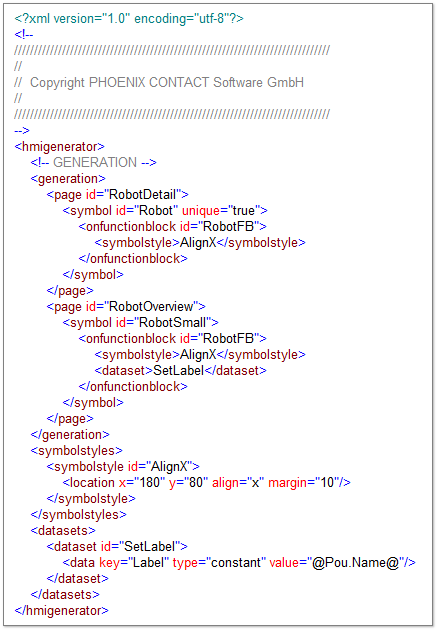 In the example, the creation of the HMI pages 'RobotDetail' and 'RobotOverview' are both triggered by the existence of the FB instance 'RobotFB' defined by the descendant <onfunctionblock> element.