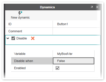 The 'Disable' dynamic disables the object depending on the value of the Boolean variable assigned to the linked HMI tag or the value of a Boolean expression and the condition selected for the 'Disable When' property. Based on the value of the Boolean variable or the evaluation result of the Boolean expression and the selected condition, the object will be disabled when the variable is TRUE or FALSE or the expression is evaluated to TRUE or FALSE. If, for example, the 'Disable When' property is set to 'True', the object is disabled when the selected Boolean variable is TRUE.