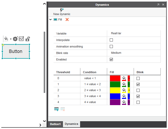 - Select the checkboxes for the conditions/thresholds for which you want enable blinking.In the example above, the button blinks from grey (current background color) to green at the medium blink rate when the value of the variable 'RealVar' is in the range 1 <= value < 2 and from grey to blue when the value is between 3 <= value < 4.