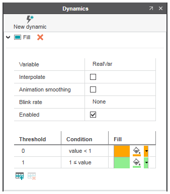 The 'Fill'/'Color' dynamics change the fill, fill when down, line or font color property of the object. Depending on the variable type linked to the dynamic, the color changes based on: