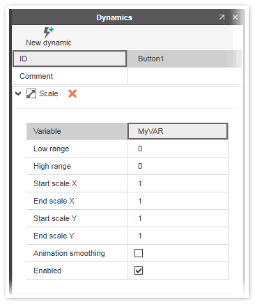The 'Scale' dynamic scales the object depending on the value of the numeric variable assigned to the linked HMI tag or the evaluation result of the expression.