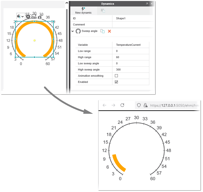The 'Sweep angle' dynamic animates the sweep angle property of a circular arc depending on the value of the numeric variable assigned to the linked HMI tag or the evaluation result of the expression. The dynamic interpolates the defined sweep angle on the circular arc based on the range from the defined 'Low range' to the 'High range' (i.e., the range of values for the control variable that is linked to the HMI tag).