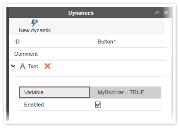 The 'Text' dynamic displays the value of the variable assigned to the linked HMI tag or the evaluation result of the defined expression ('false' or 'true') in a text object. If the dynamic is configured, the static 'Text' specified on the standard tab in the properties window is ignored.