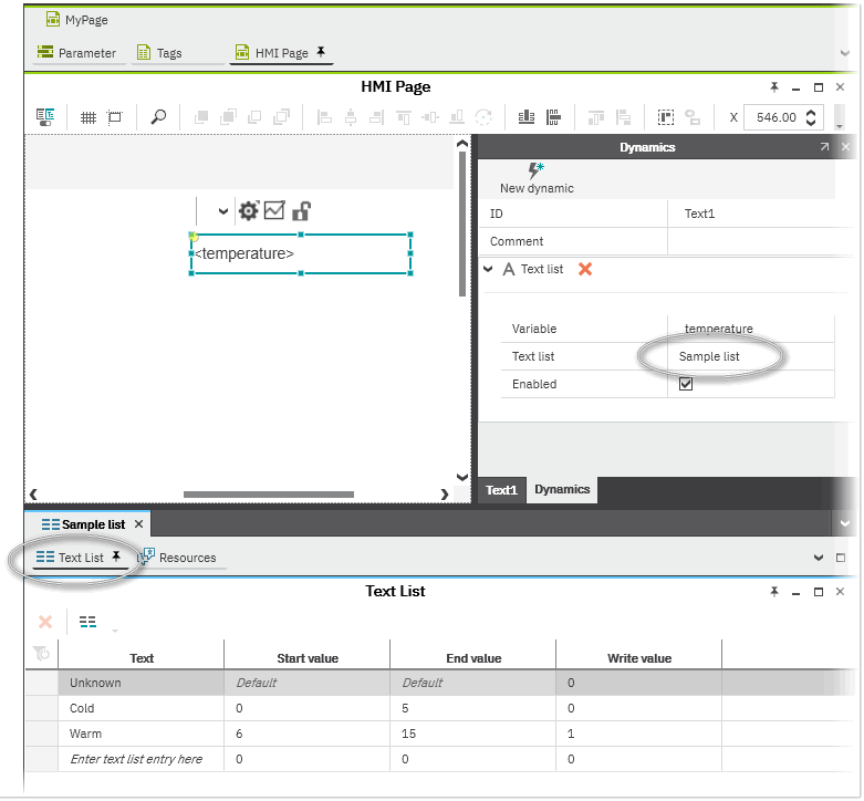 With the following configuration, the text "Cold", as defined in the connected text list 'Sample list', is displayed for the HMI text object at runtime if the value of the integer variable 'temperature' lies in the range between 0 and 5. If the variable value is between 6 and 15, the text "Warm" is displayed. If the variable value is not within the range of 0 to 15, the default text "Unknown" is shown.