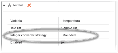 - Connect a numeric variable to the dynamic. To do so, click the input field right of the 'Variable' field and select a variable. The value of this variable determines which text is displayed in the HMI object when executing the HMI application. Depending on the value of the configured variable, the text entry from the associated text list is displayed at runtime.When binding a variable of type REAL/LREAL to the 'Text list' dynamic, the 'Integer converter strategy' field is additionally shown. Here you can set whether the variable value is truncated or rounded before it is used as source value.