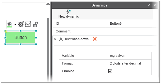 With the following configuration, the value of the real variable 'myrealvar' with an accuracy of 2 digits after the decimal point is displayed for the button object at runtime when the button is pressed.
