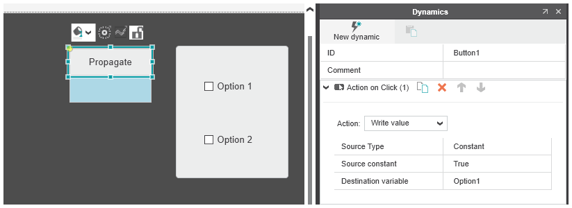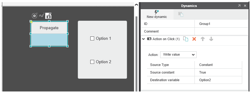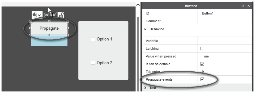 With this configuration, the checkboxes 'Option 1' and 'Option 2' will be activated when the user clicks the 'Propagate' button. Clicking the object group, the checkbox 'Option 2' will be activated. (With deactivated 'Propagate events' checkbox, clicking the 'Propagate' button will only activate checkbox 'Option 1'.)