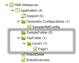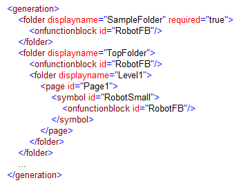 In the following example, the folder 'SampleFolder' and the folder 'TopFolder' with the nested folder (subfolder) 'Level1' are created. The creation of all folders is triggered by the existence of the FB instance 'RobotFB' defined by the descendant <onfunctionblock> elements. Setting the 'required' attribute to "true" for the 'SampleFolder' ensures that the folder is created even it contains no descendant <page> / <folder> element.