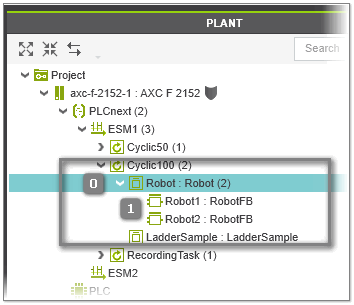 | level | Specifies for which FB instance node level as represented in the PLANT under the program instance node the creation is triggered. You can use this attribute to limit the creation to a specific node level.The program instance ('Robot' in the following example) has level 0 (root node). The child nodes (FB instances 'Robot1' and 'Robot2' in the example) have level 1 and so on.