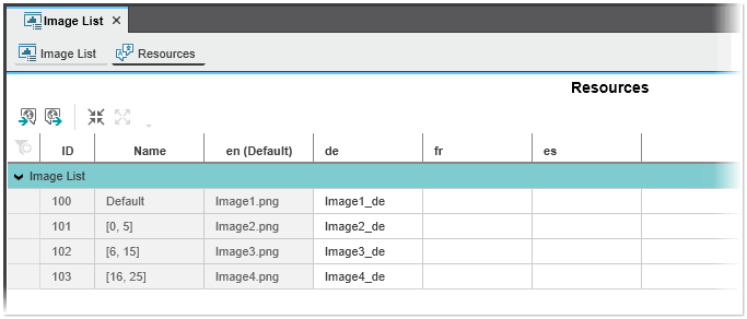 The 'Resources' editor contains a single line for each image list entry which is defined in the 'Image List' editor. Each image list entry consists of an ID, name and the source image in the default language and its language-specific versions. (The ID and name are read-only and created automatically; the name is created from the value range defined for the image list entry.)