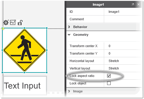 The following example shows an HMI symbol containing a text input box and a sign (which could be implemented as a symbol, an image, or a group). The checkbox 'Lock aspect ratio' is activated for the sign.