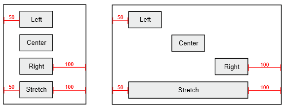 The following example illustrates the four horizontal layout options: 'Left', 'Center', 'Right', and 'Stretch'. The graphic shows the content of an HMI symbol definition in the default size (left image) and an instance of that symbol that has been widened (right image).