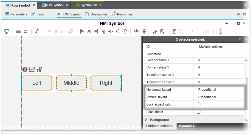 | Use Layout Properties | The HMI symbol instance retains its original properties when resizing it. The content of the symbol instance will not be changed, i.e., the size of the symbol instance is adjusted based on its content.For example, when resizing a symbol instance composed of a rectangle with an outline and a text field, then the width of the outline does not become thicker and the text size is retained when scaling the object.