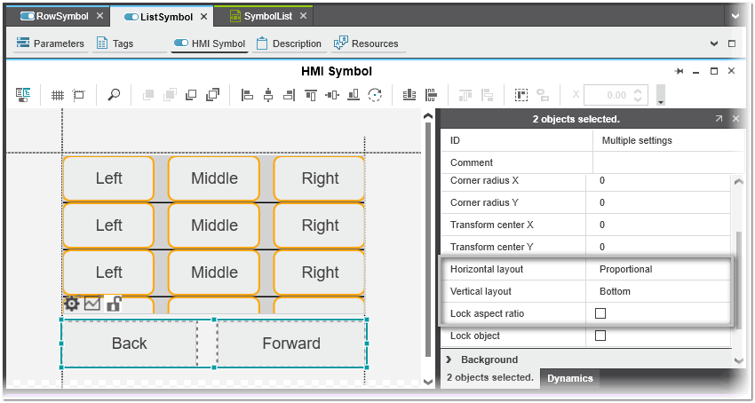- Proportional - The object and the space around the object within the HMI symbol definition are expanded in the same manner (for an example, see the 'Horizontal layout' description above).