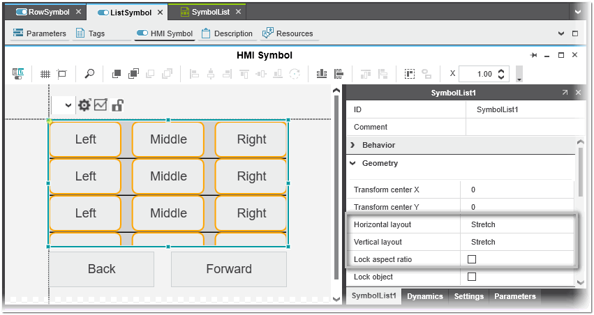 In this example, the 'RowSymbol' is used as symbol instance for the symbol list added to the 'ListSymbol' symbol definition. The 'RowSymbol' contains three buttons