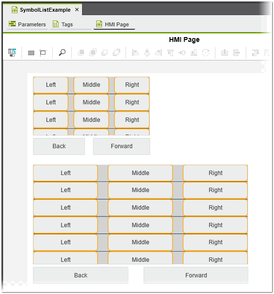 When you add an instance of the 'ListSymbol' to an HMI page and expand the instance on the page (as shown in the following figure), the buttons are expanding intelligently, i.e., they retain their heights, font sizes, line widths, etc. New table rows are added in the symbol instance when it is expanded vertically. All of the space available in the symbol instance is used. (The following graphic shows the content of the symbol definition in the default size (top image) and an instance of that symbol that has been expanded (bottom image).)