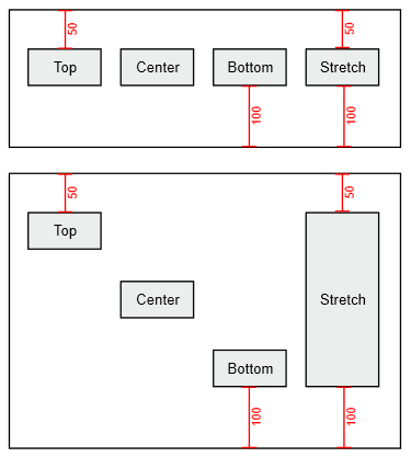 - Stretch - The topmost point of the object is top-aligned to the topmost part of the container (an HMI symbol or group) and its bottommost point is bottom-aligned to the bottommost part of the symbol. This means, the object is anchored to both the top and to the bottom of the symbol.
