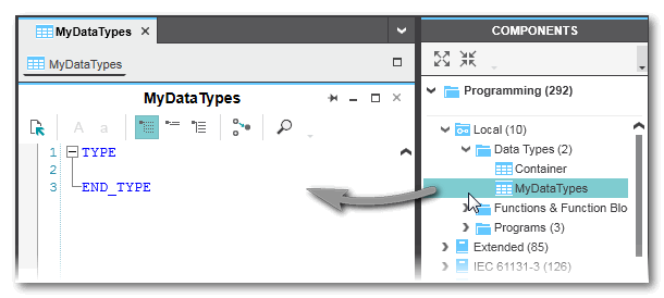 To open a data type worksheet in the editors area, double-click the worksheet icon under 'COMPONENTS | Programming > Local > Data Types' (or any subfolder).