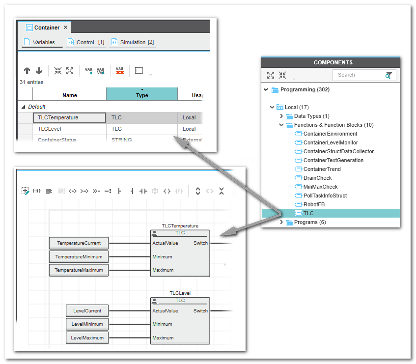 - Double-clicking a POU type in the 'Programming' category of the COMPONENTS area opens the code editors (textual and/or graphical) and the variables table (arrows 1).