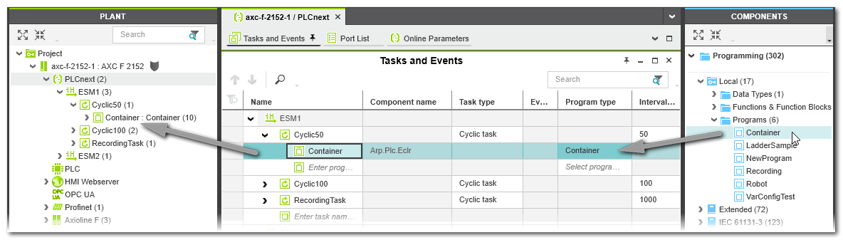 - Double-clicking the 'PLCnext' node in the PLANT opens the PLC runtime editors used to configure the tasks and events (arrow 3).