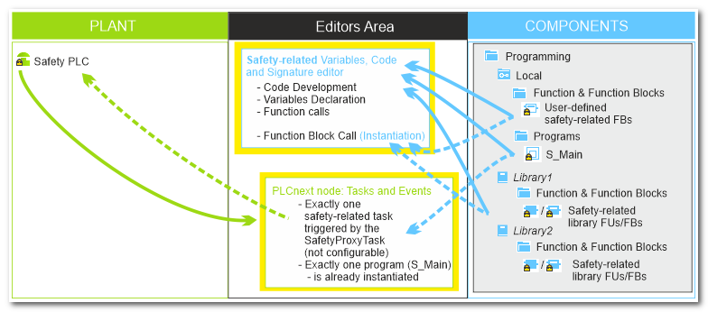 For the safety-related application executed by the integrated Safety PLC, the following applies: The Safety PLC executes exactly one task in which exactly one safety-related program must be instantiated. Both the safety-related task and program instance are created automatically on insertion of a controller with a Safety PLC in the PLANT. Further safety-related programs can be created in the COMPONENTS area but they are not executed. Safety-related FBs can only be called in other safety-related programs/FBs.