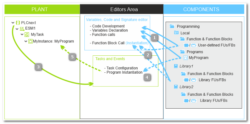 In the 'Tasks and Events' editor, program POUs can be instantiated by assigning them to a task (dashed arrow 4).