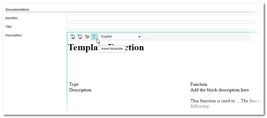 icon ('Insert template') on the toolbar. Depending on the POU type you are editing, the content of the TemplateFunction.htm or TemplateFunctionBlock.htm stored in the help template folder (see above) is inserted into the description area.Note