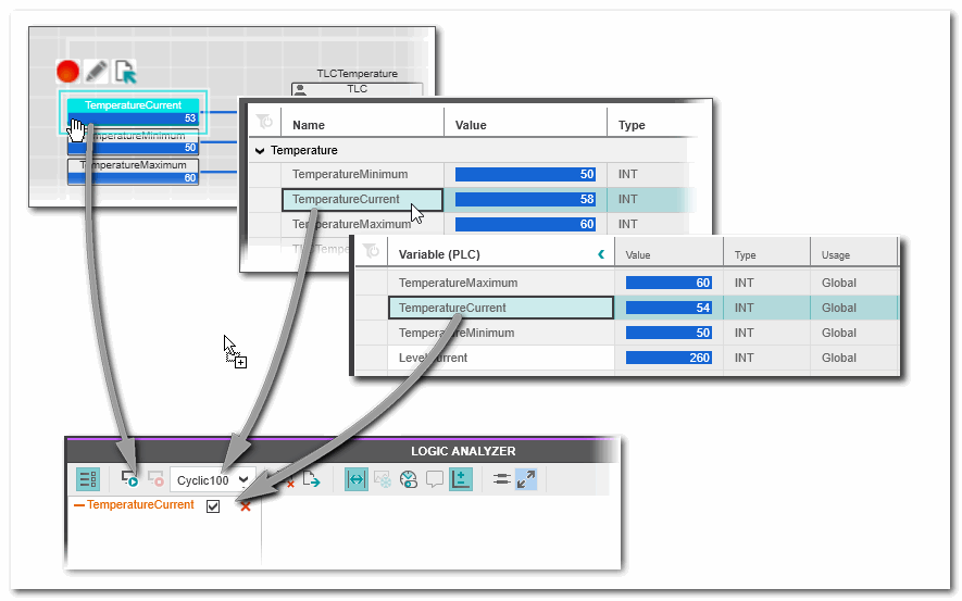 - The LOGIC ANALYZER supports variables and ports from IEC 61131-3 POUs as well as ports from (external) non-IEC 61131-3 programs.