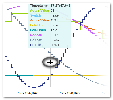 As soon as values have been recorded, you can display a popup that shows the exact variable values at the current point in time (first marker).