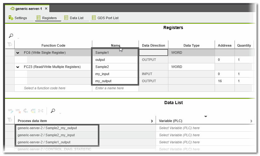 - In the 'Name' column, enter a register name (description of the register) and press <Enter>.Depending on the selected function code, an access type (default names: 'input' and/or 'output') is added (for each access type a new table row is added after the selected function code). In the 'Data List' editor of the server the process data item with the name built from the register name and the access type is automatically created. The same applies to the port name in the 'GDS Port List' of the server.