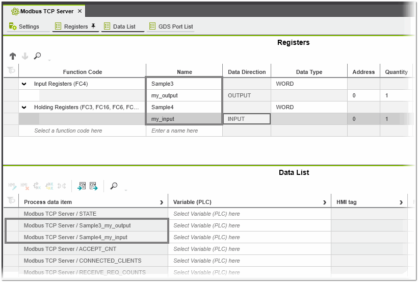 - In the 'Name' column, enter a register name (description of the register) and press <Enter>.Depending on the selected function code, an access type (default names: 'input' and/or 'output') is added (a new table row is added after the selected function code for each access type). In the 'Data List' editor of the server the process data item with the name built from the register name and the access type is automatically created. The same applies to the port name in the 'GDS Port List' of the server.