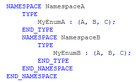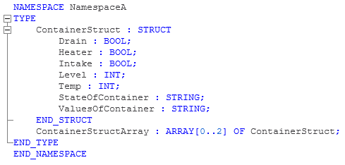 The predefined keywords NAMESPACE ... END_NAMESPACE are used to declare a namespace for a user-defined data type (ARRAY, STRUCTURE, etc.) in the data types worksheet. The namespace definition starts with the keyword NAMESPACE followed by the namespace name and ends with the keyword END_NAMESPACE as shown in the following example. The NAMESPACE keyword must follow the TYPE ... END_TYPE declaration block that is part of the namespace.