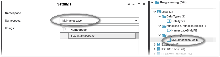 Defining a namespace in the 'Settings' editor of the POU