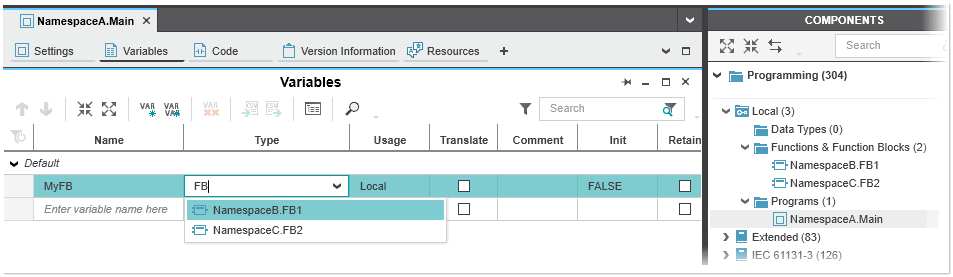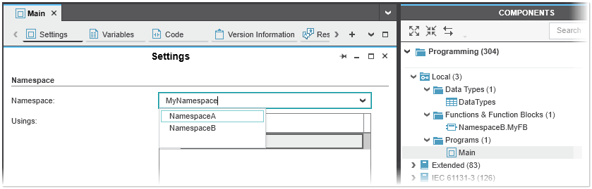 If the namespace for a POU is changed in the 'Settings' editor, the namespace is automatically updated in the COMPONENTS area and vice versa.