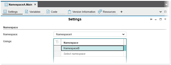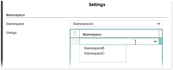 2. In the 'Usings' table, left-click into the combobox below the table header and select a namespace from the list or enter the name of the desired namespace (Intellisense is supported). Confirm the selection with <Enter> or clicking outside of the combobox. The selection list contains all namespaces (including the nested namespaces) that are available in your project. (When you confirm the selection, a new empty entry is added to the table).