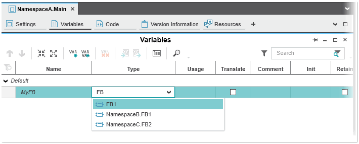 2. Enter the namespace by prefixing the POU name with the namespace name followed by a . (dot), e.g., NamespaceA.MyFB.