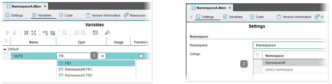 To use a POU outside of the namespace where it is defined, you usually have to specify the full qualified name of the POU. For example, if you want to instantiate the FB POU 'NamespaceA.MyFB' in a program POU, you have to specify the full qualified name 'NamespaceA.MyFB' in the program POU. In order not to have to enter the full qualified name every time, you can add the namespace of the FB POU to the list of 'Usings' of the program POU. This allows you to use the short name (without namespace identifier) of the FB POU in the calling program POU (see also the example below).
