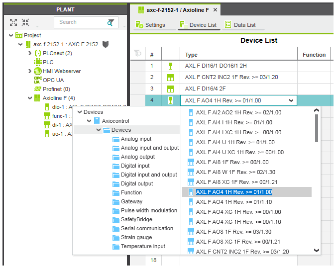 - Double-click the 'Axioline F' node in the PLANT and open the 'Device List' editor in the editors area.
