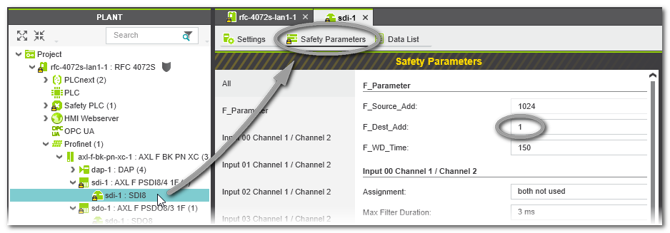 - In the PLANT, expand the safety-related Profisafe device under the 'Profinet' node and double-click the submodule node. Open the 'Safety Parameters' editor.