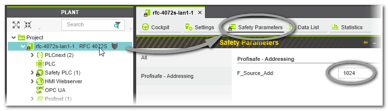 - The Safety PLC (no. (1) in the figure) acts as F-Host of the Profisafe network you are currently developing in your PLCnext Engineer solution (2). Therefore, it needs an F_Source_Address for its own Profisafe network.