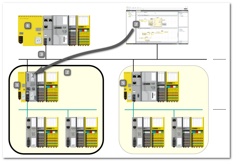 - At the same time, the Safety PLC (1) in your solution (2) acts as F-Device in a superimposed Profisafe network (3). This superimposed Profisafe network has its own F-Host (4) and possibly further F-Devices (5) besides your Safety PLC (in further subordinate networks). In this case, your Safety PLC also needs an F_Destination_Address as Profisafe client of the superimposed network.