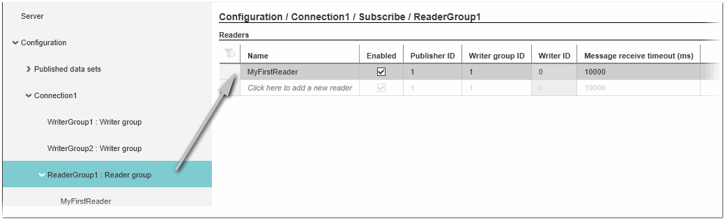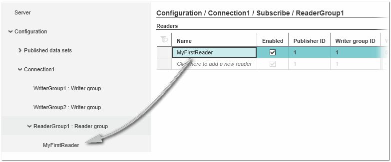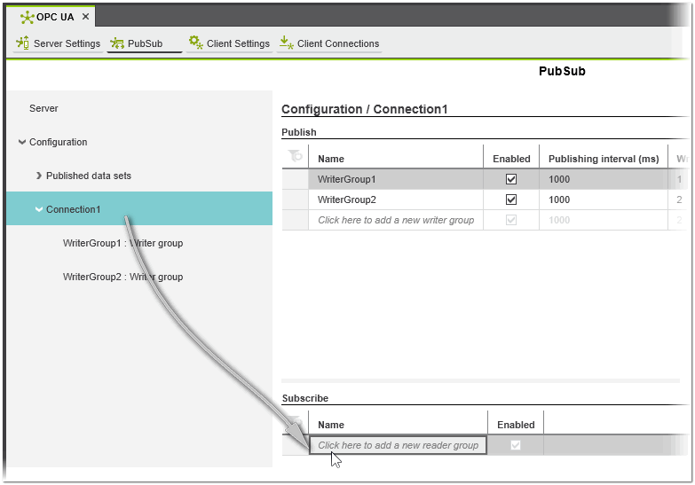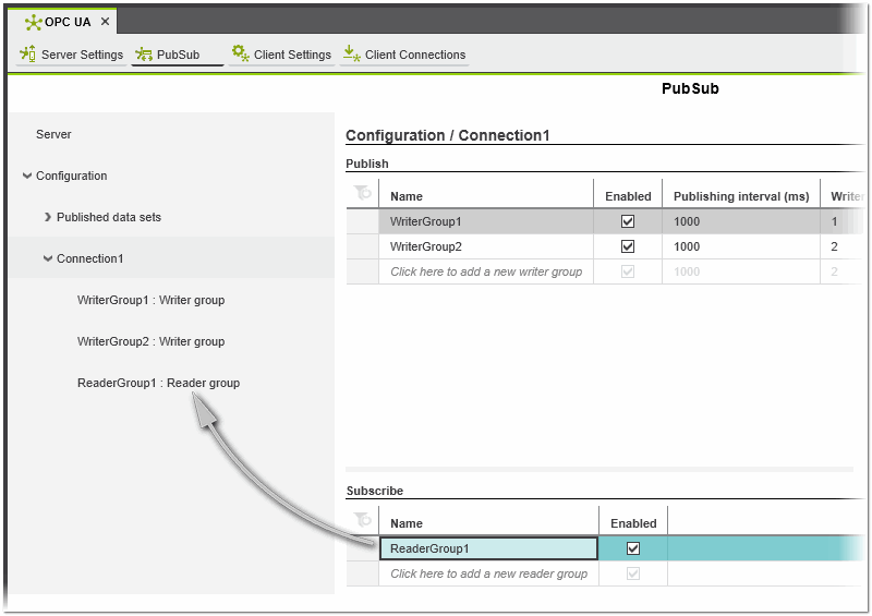 In addition to manually adding a new reader group as described in the following procedure, you can also import a reader group with the contained readers from an external PubSub configuration of a remote OPC UA server. See the topic "Importing External Configurations from Remote Servers" for details. |